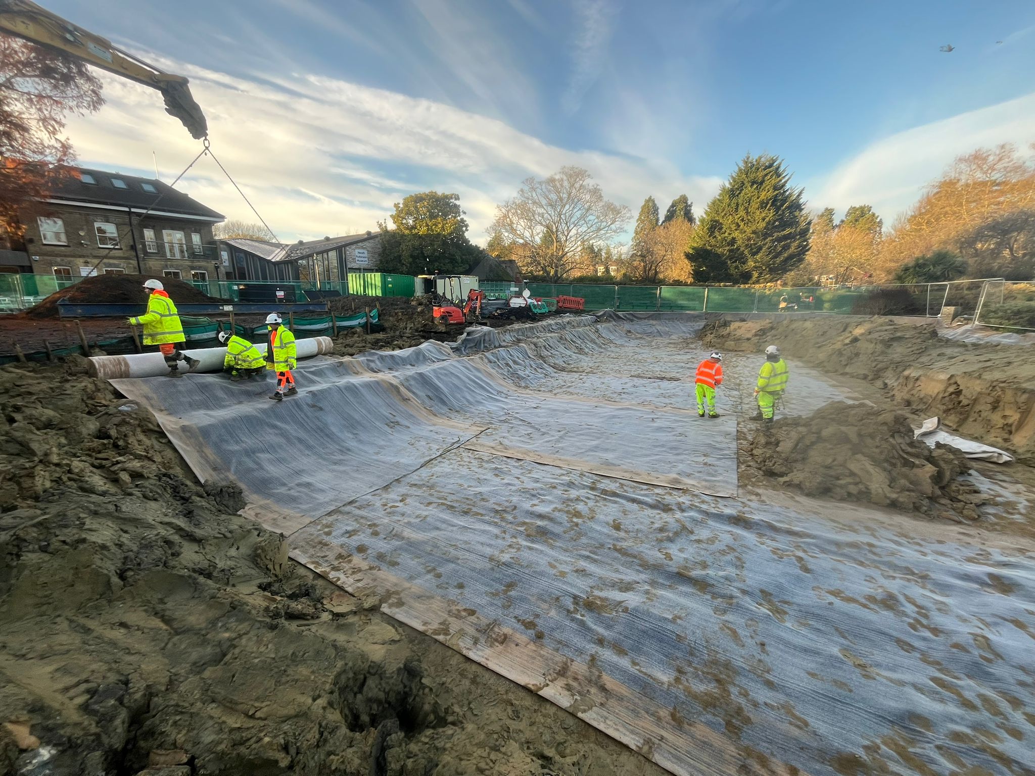 Following the draining and desilting of the pond, we found an unexpected removal of a concrete layer on top of the existing failed liner which has caused a delay.